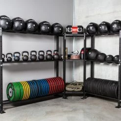 Rogue’s Mass Storage Corner Shelves are designed for use exclusively with our 2-Tier and 3-Tier Mass Storage racks, helping gym owners utilize the “dead zone” space typically created between two units in the corner of a room, or around a protruding wall.