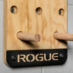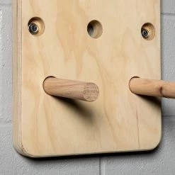 The official, wall-mounted Rogue Peg Board is made in the USA from your choice of top-quality maple or pine. Each set includes one 1.5″ thick board (89.75” tall x 11.75” wide) and two grip-friendly wood dowel rods—each measuring 6.5” in length and 1.19” in diameter.