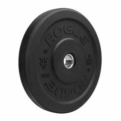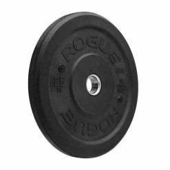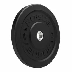 The improved finish is all-black with embossed Rogue branding and weight indications. The shore A durometer rating is approx. 80 and the weight tolerance is +/- 2% of the indicated measurement.