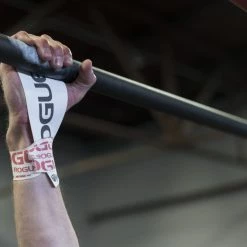 Rogue BarAides are durable, Military-grade hand grips developed specifically for high-intensity workouts, protecting against tears and abrasions. This RX brand of BarAides, available here in white with the Rogue logo in black, includes expandable finger holes (“one size fits most”) and a proprietary polymer core.